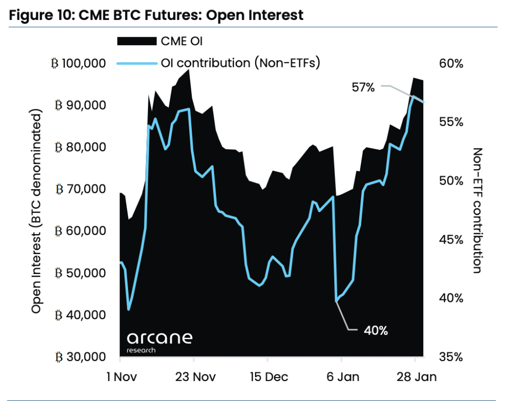 One indicator of high institutional interest in Bitcoin was the growing CME Open Interest in Bitcoin. According to Arcane Research, the proportion of Open Interest in Bitcoin that is not related to exchange-traded funds (ETFs) increased from 53% to 57%.