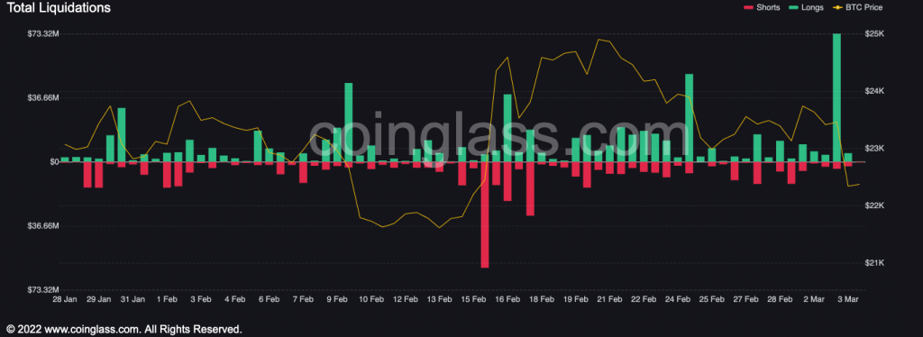 Following the sharp decline in Bitcoin’s [BTC] price in the early trading hours of 3 March, long liquidations soared to a seven-month high, data from Coinglass showed.