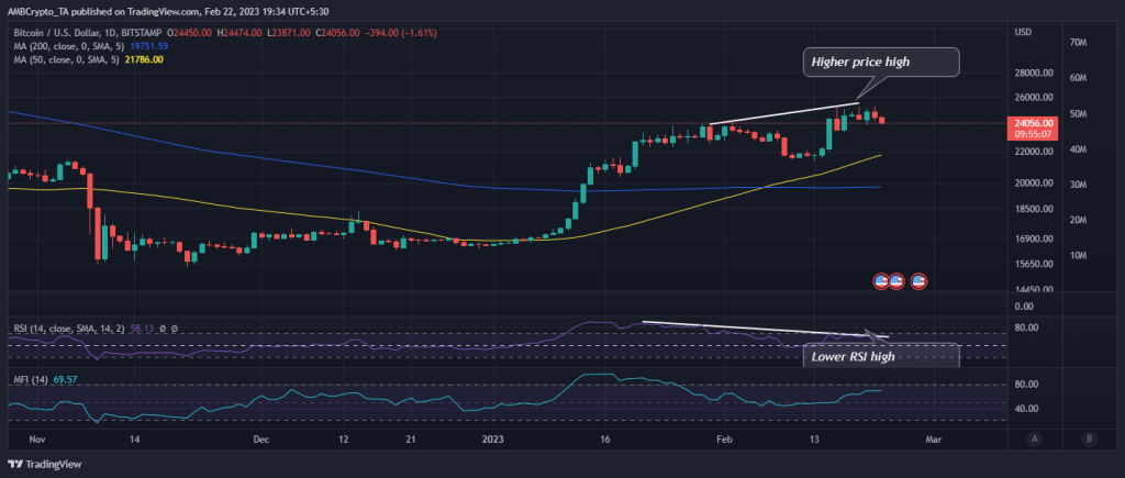 BTC recently tested a key resistance level at $25,000, triggering some sell pressure. This was exasperated by a price-RSI divergence. The events confirmed a trend weakness in the latest price rally and coincided with the expectation of sell pressure at the resistance level.