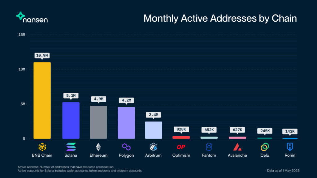 According to the on-chain analytics platform Nansen, BNB Chain had the most active addresses in April, with 10.9 million.