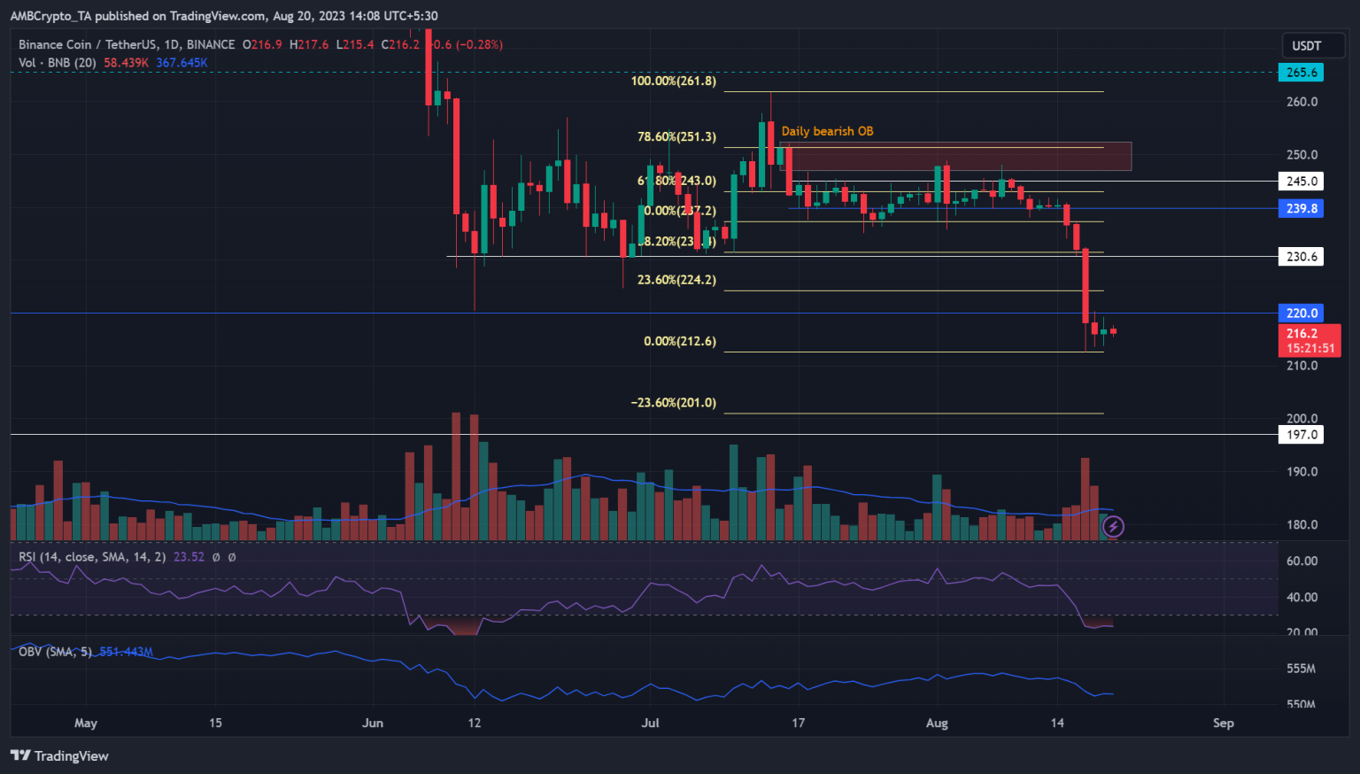 BNB’s extended drop on Friday (17 August) cleared a crucial psychological level of $220. The level stopped the June dump and was a bulls’ rescue during the December 2022 slump. But it failed to hold up the recent sell pressure.