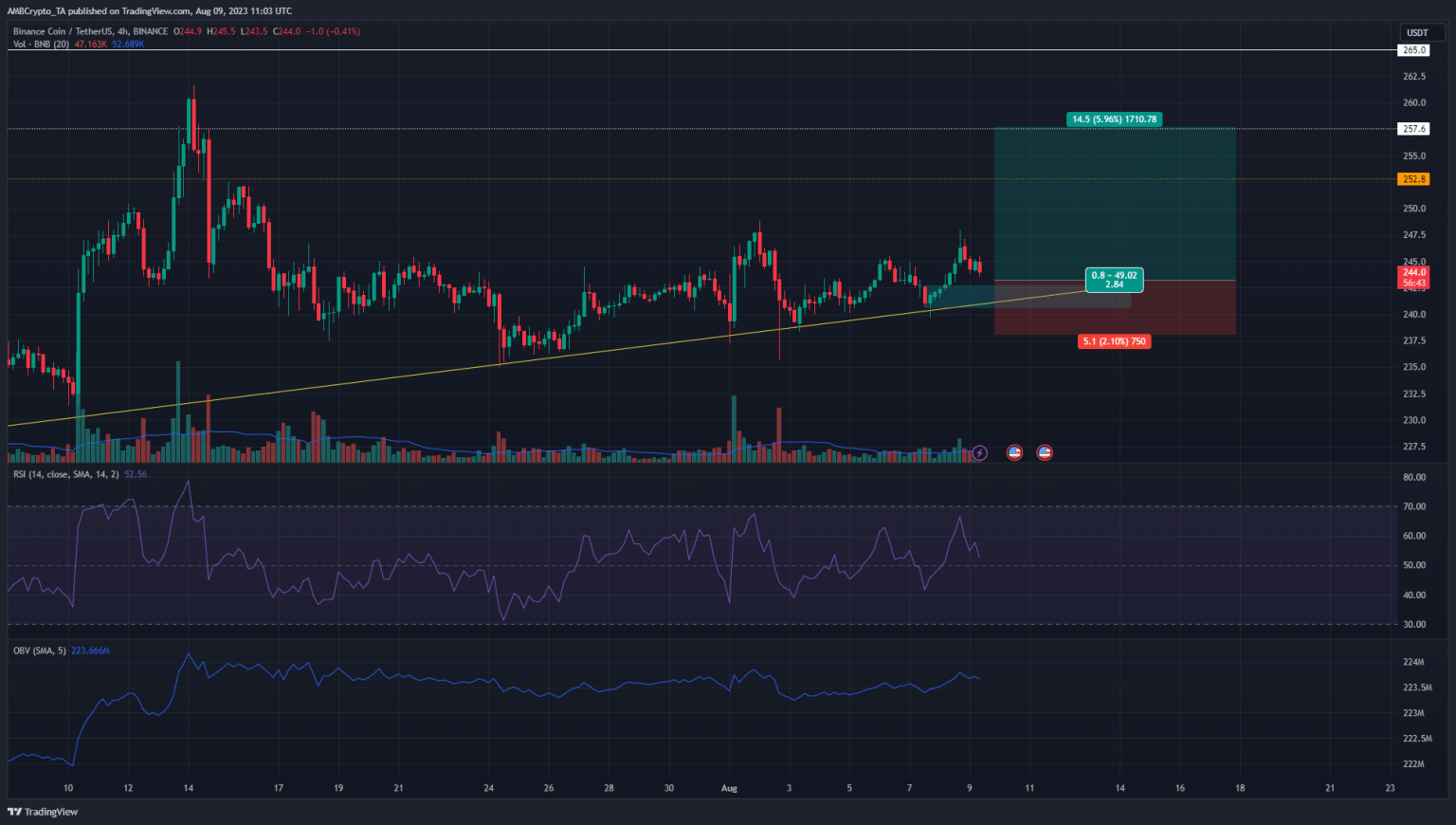 A revisit to the bullish order block at $240 or the trendline support could offer a buying opportunity with a tight stop-loss. The idea would be invalid if BNB slipped below the $238.4 level, a local low from 3 August.