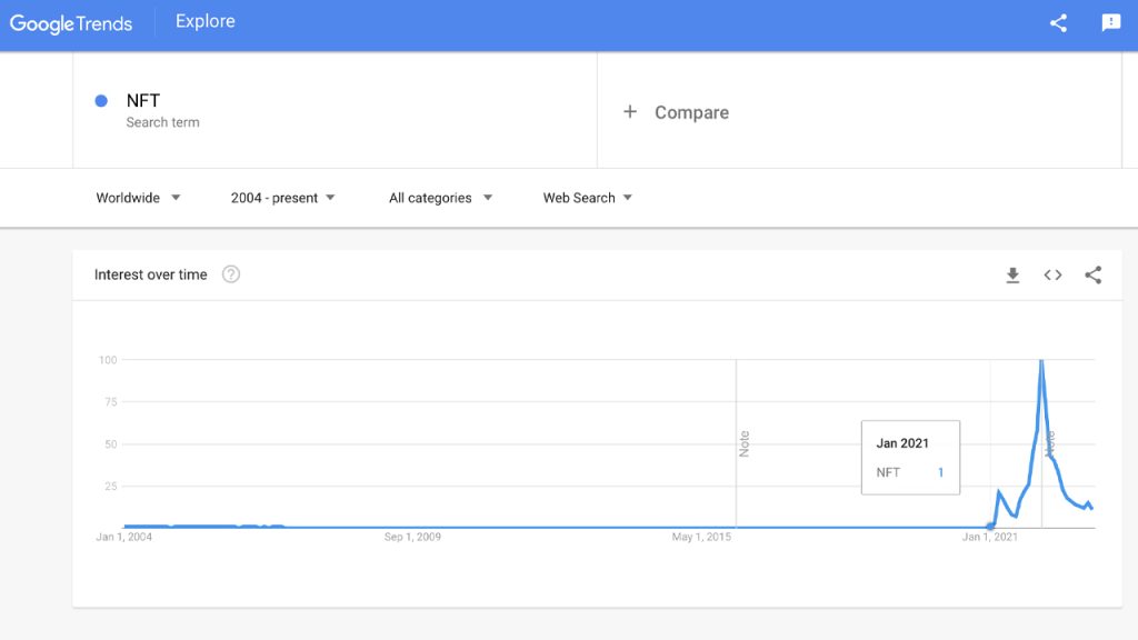Two years ago, the search query “NFT” first appeared on Google Trends (GT), reaching a score of 1 out of 100 in the first month of 2021. Before that time, GT data shows little to no interest in NFTs, despite their existence since 2014. A year later, NFTs were quite popular and the search query reached a score of 100 as searches for the term skyrocketed. Another year later, interest in NFTs has decreased significantly, with the search query reaching a score of 11 out of 100 during the week of January 22-28, 2023.