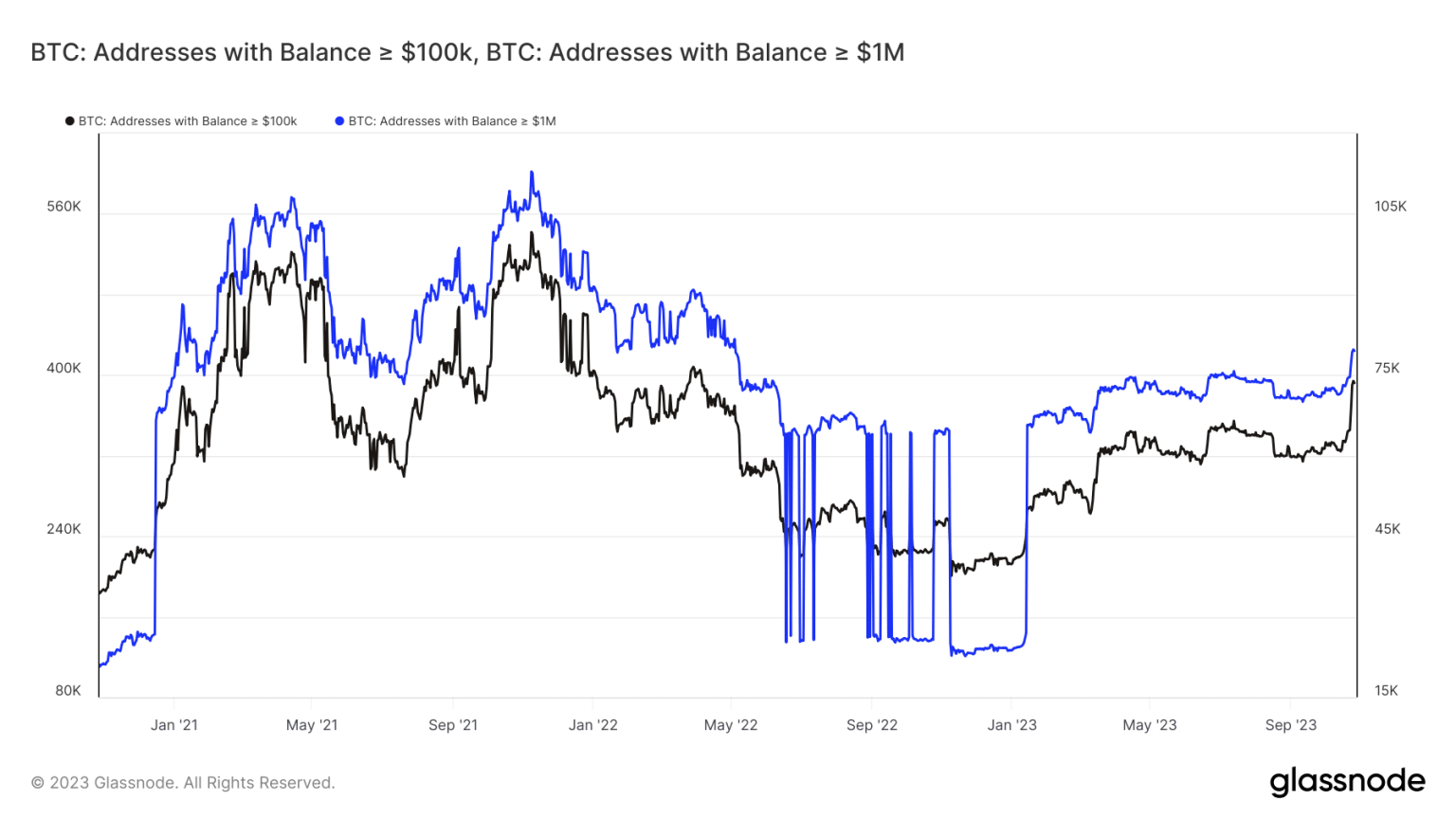 Take for example the amount held by the largest BTC addresses. Addressees holding at least 100,000 BTC and those holding over 1 million BTC have been aggressively accumulating Bitcoin in the last two weeks.