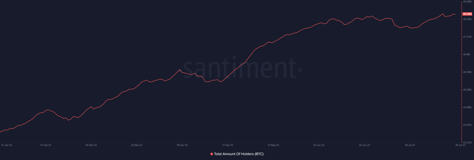 Based on data from Santiment, Bitcoin has been witnessing an increase in holders. The chart revealed a significant addition of holders from Q1 until the present moment. As of this writing, the number of holders had surpassed 48 million and continued to rise.