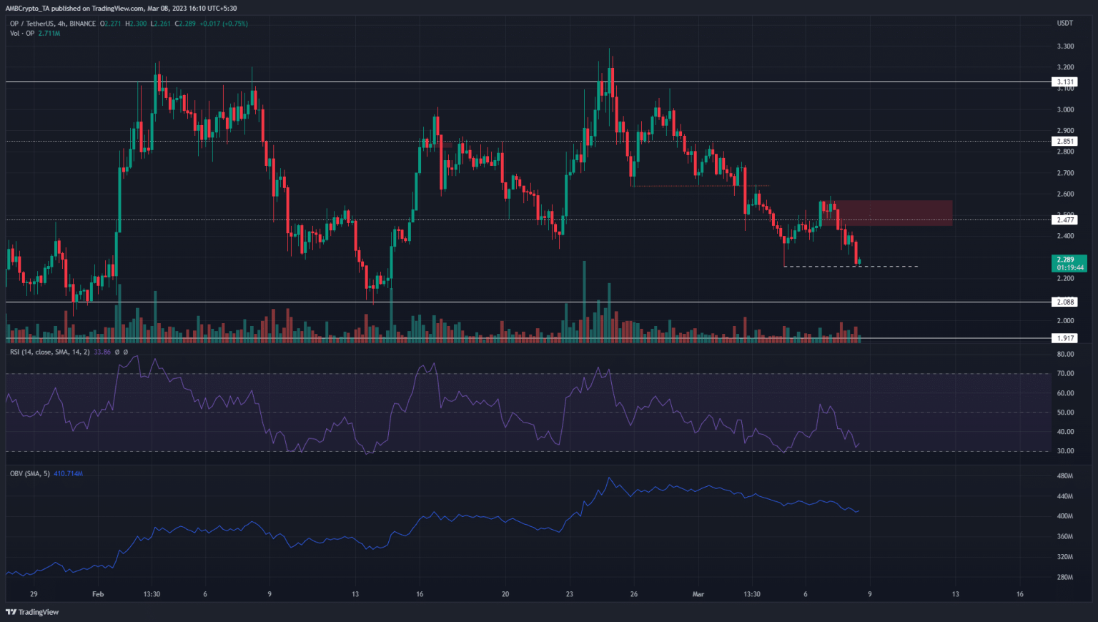 On the other hand, aggressive selling in the coming hours could push OP under $2.25. In that scenario, a retest of the $2.25-$2.4 region can be used to short the asset. However, the structure would only be broken on a move back above $2.59, which makes this scenario riskier for traders.