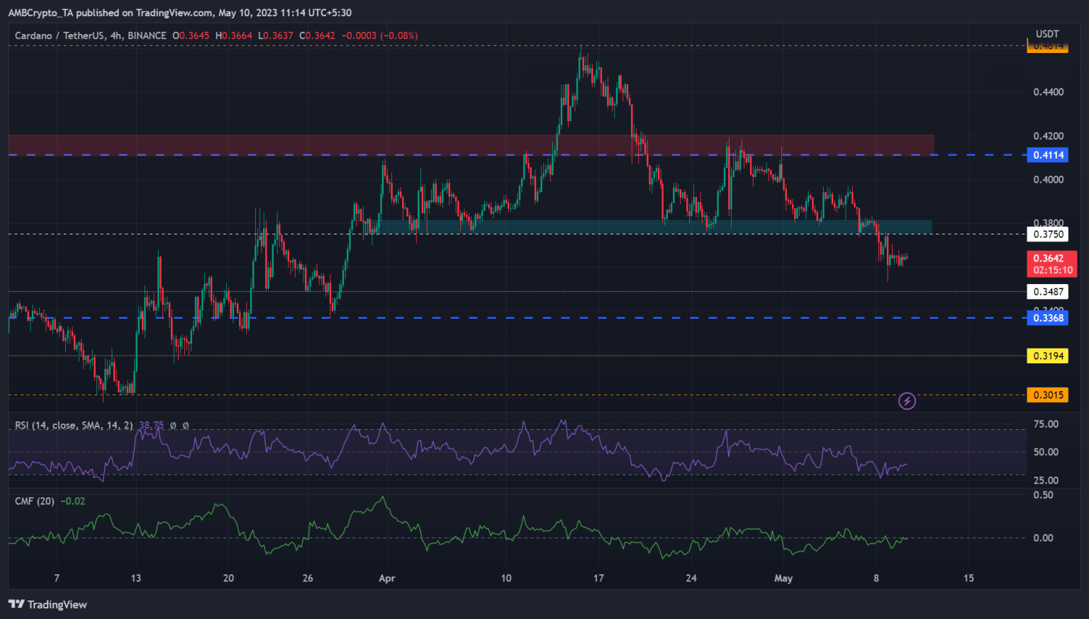 The attempted recovery by bulls on 8 May was blocked by the $0.3750 level – effectively flipping it to resistance. At the time of writing, price action hovered below it, as RSI and CMF remained negative – a bearish short-term outlook.