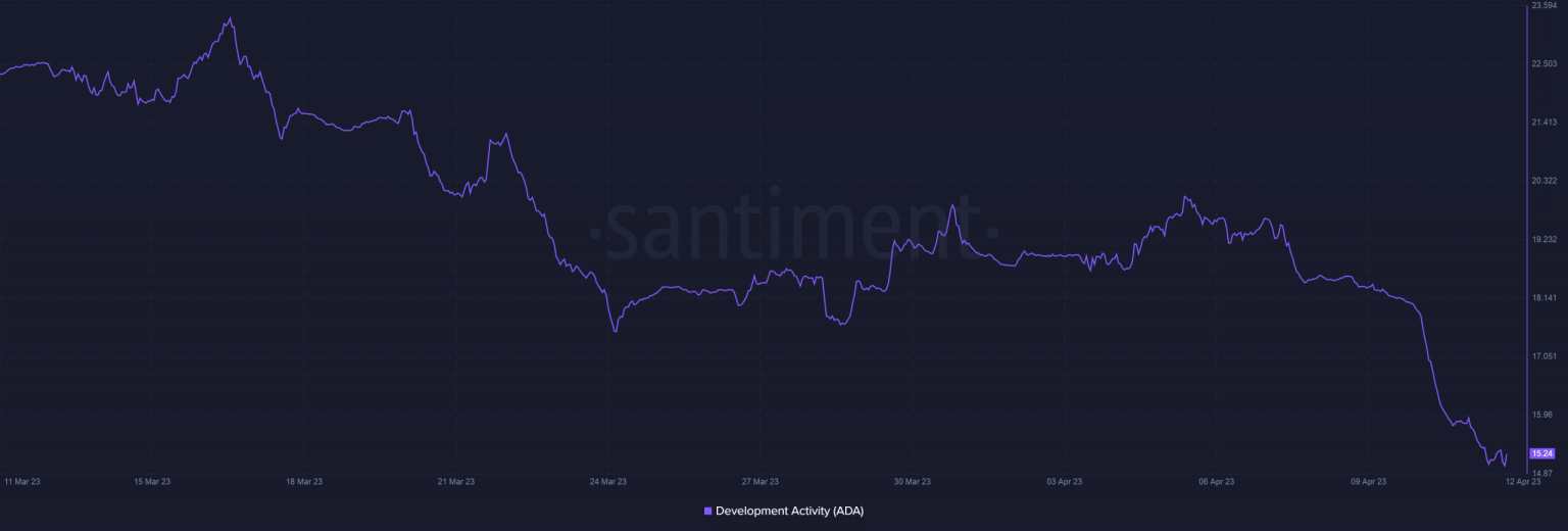 Cardano [ADA] network’s development activity fell remarkably over the last 30 days, plunging to a three-month low, at the time of writing, as per data from Santiment.