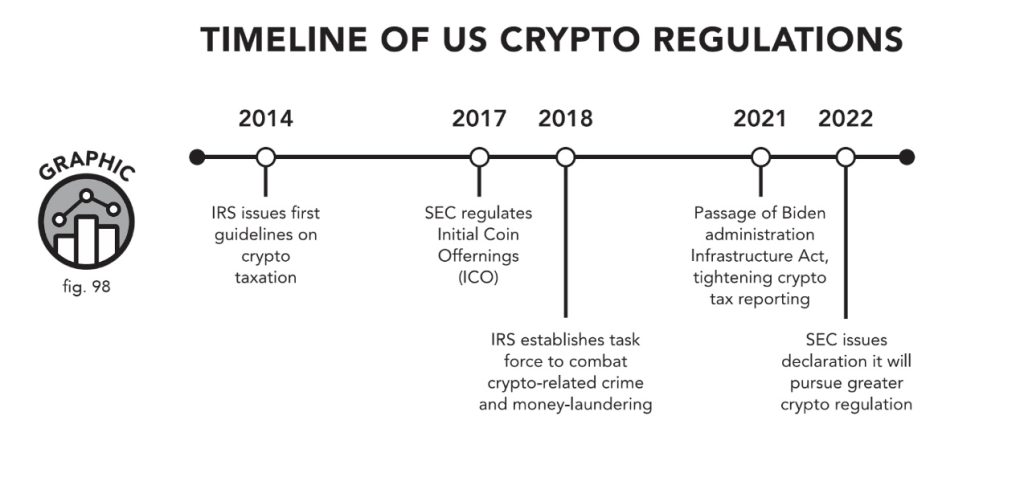 For example, Hillary Clinton, calling attention to the risks of crypto and the need for regulation, said at a Bloomberg conference in Singapore in 2021, “One more area that I hope nation-states start paying greater attention to is the rise of cryptocurrency because [it] has the potential for undermining currencies, for undermining the role of the dollar as the reserve currency, for destabilizing nations, perhaps starting with small ones but going much larger.” These are strong words, and governments have begun to take claims like these seriously. Despite crypto’s decentralization, regulation appears inevitable and could profoundly alter its development and adoption worldwide.