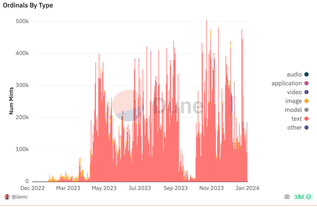 Mentioning types, text-type ordinals continued to lead, followed by others like image-type ordinals. Thanks to the high number of mints, Bitcoin’s taproot utilization also spiked.