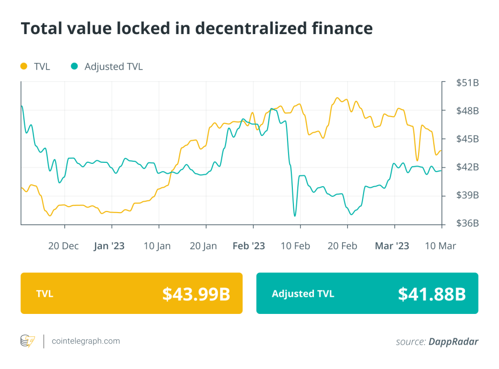 Analytical data reveals that DeFi’s total market value dipped below $45 billion this past week. Data from Cointelegraph Markets Pro and TradingView shows that DeFi’s top 100 tokens by market capitalization had a bearish week, with most of the tokens trading in red, barring a few.