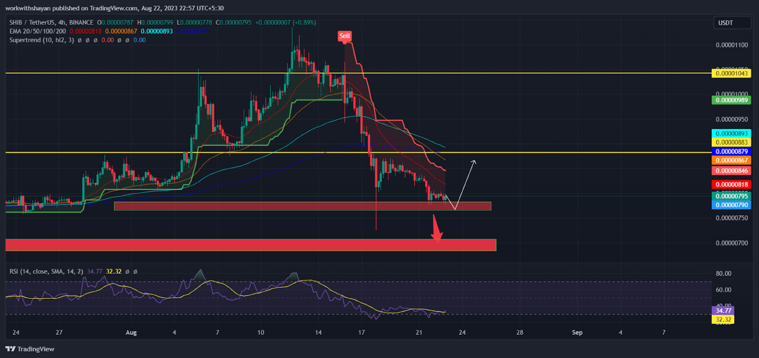 The bulls have successfully maintained Shiba Inu above the crucial $0.0000078 support level in recent days. Moreover, they are attempting to trigger a significant rebound from that level.