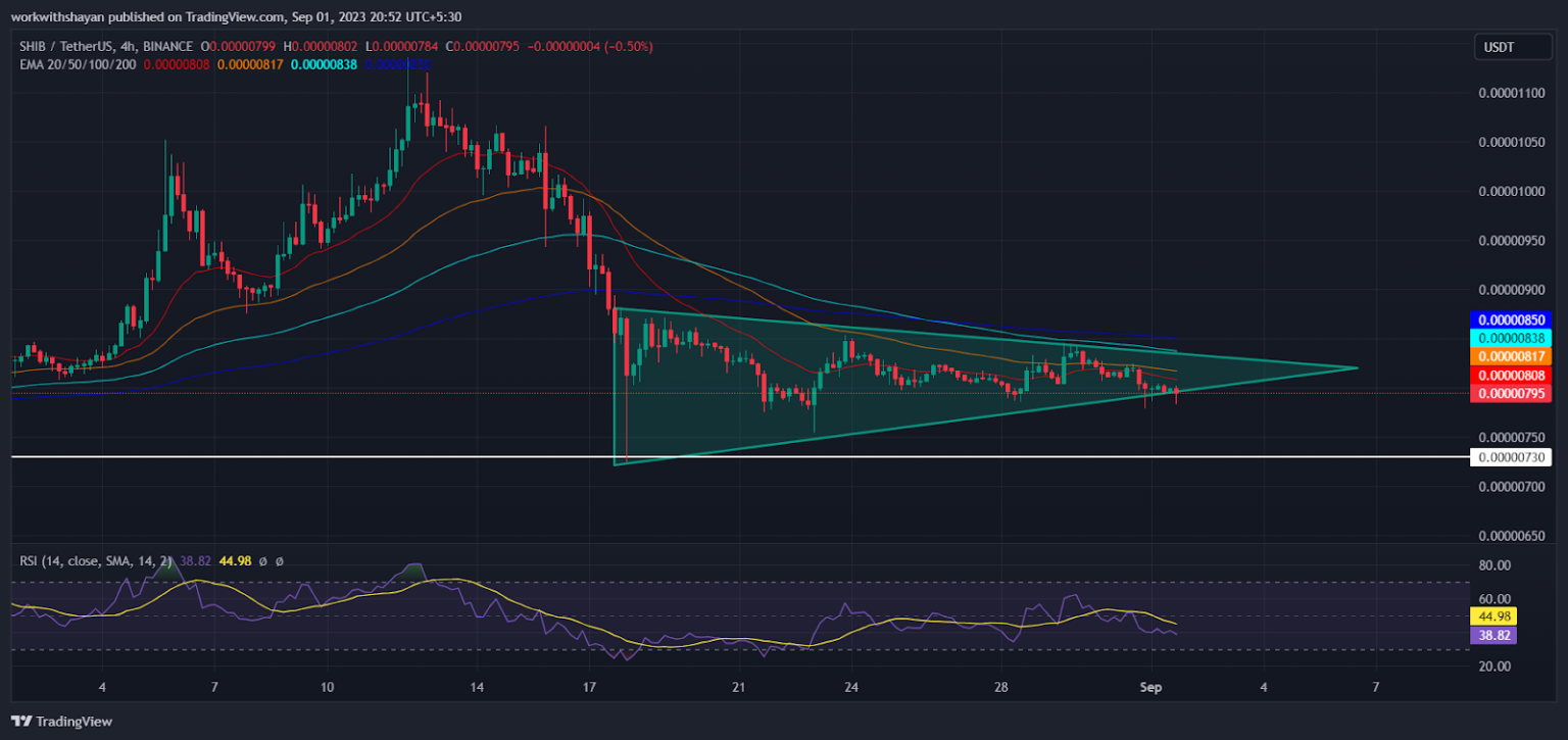 Analyzing the 4-hour price chart of Shiba Inu, bears are currently attempting to break below the symmetrical triangle pattern’s uptrend line. Despite bullish pressure, there’s a growing selling domination among traders amid the market selloff. As of writing, SHIB’s price trades at $0.0000079, declining over 2.5% in the last 24 hours.