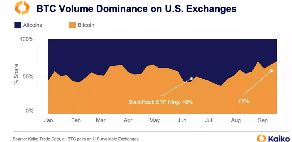 Additionally, Bitcoin’s [BTC] dominance on US exchanges witnessed a substantial upswing. According to Kaiko’s data, the dominance reached 71% last month, marking its highest level since October 2022.