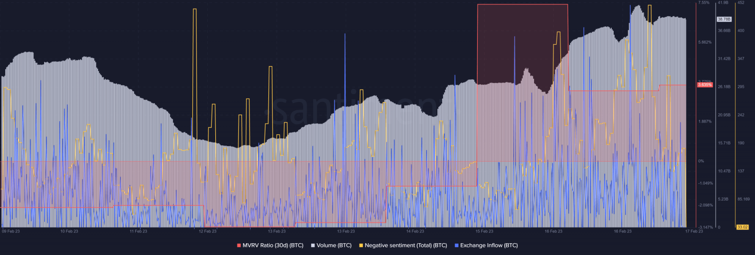 Santiment’s chart also pointed out a few interesting metrics. BTC’s recent price decline was accompanied by high volume, further legitimizing the downtrend. Negative sentiments around BTC spiked in the last few days, indicating less trust among investors in the coin. Moreover, BTC’s exchange inflow increased considerably.
