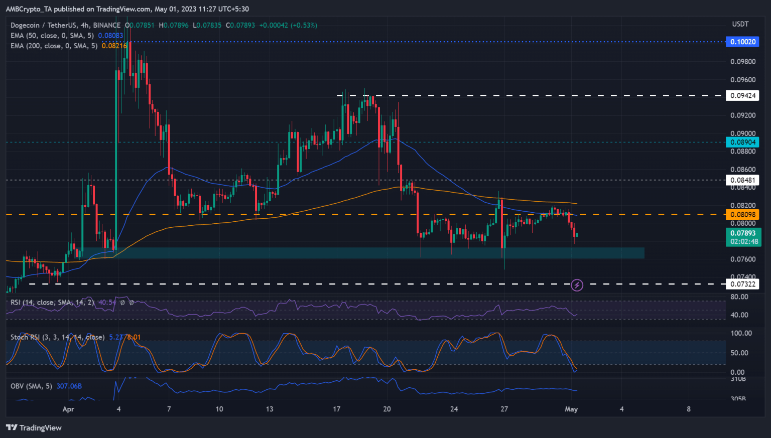 Conversely, DOGE could witness more aggressive selling if the support cracks. A close below $0.07600 could sink DOGE to lower supports at $0.07322 or the March swing low of $0.06500 in an extreme downswing scenario. The downtrend could be accelerated if Bitcoin [BTC] drops below $28k.