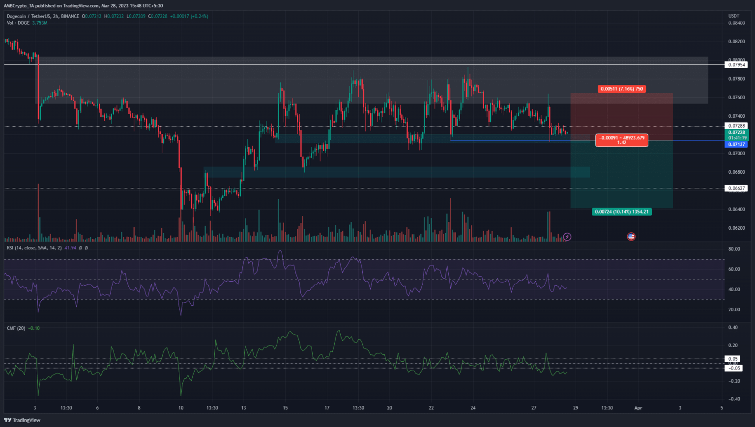 Bitcoin [BTC] could see some volatility after dropping to $26.5k on 27 March. In this scenario, a bounce for DOGE would offer short sellers a better risk-to-reward region to sell Dogecoin.