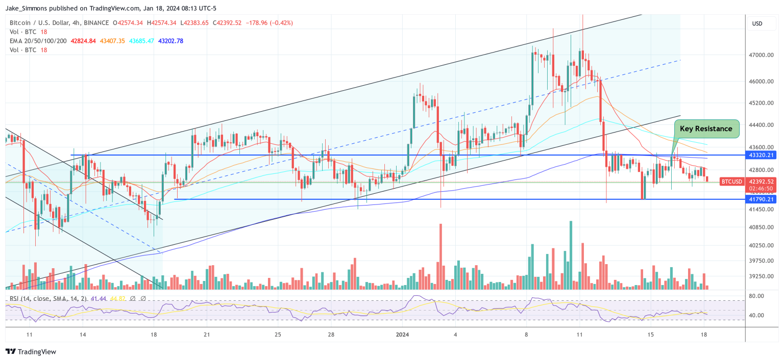At press time, the Bitcoin price continued its sideways trend, trading at $42,392.