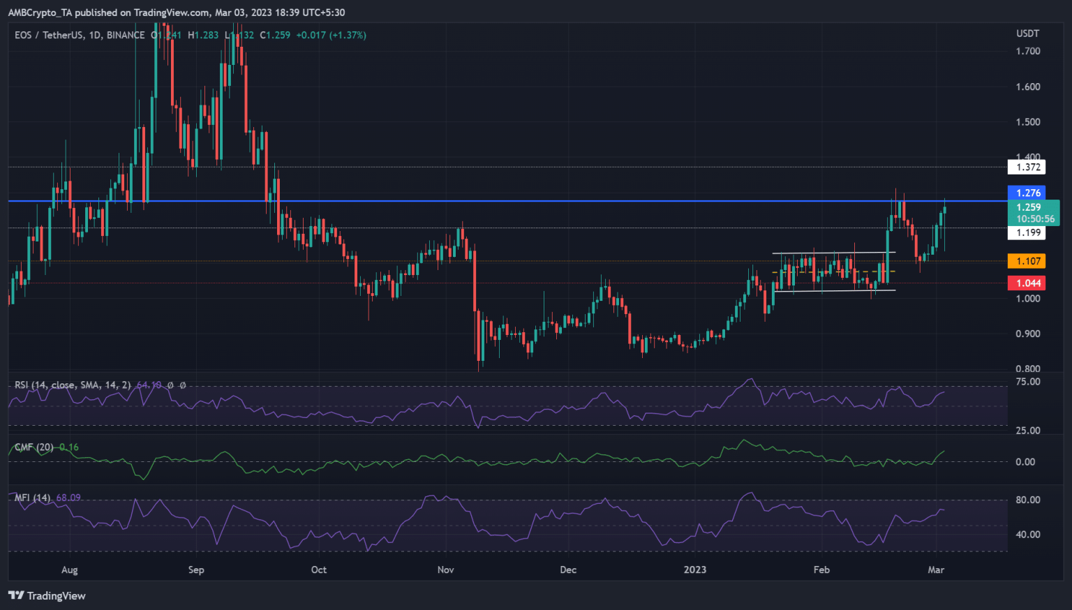 EOS consolidated within the $1.022 – $1.130 range between mid-January and February before an upside breakout in mid-February. But the bulls faced price rejection after hitting the $1.276 resistance level. If the trend repeats, EOS could face a similar rejection and offer bears shorting opportunities.