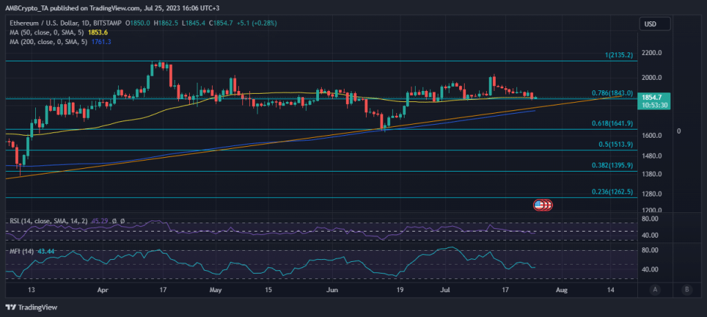 ETH exchanged hands at $1,852 at press time and its current range may act as a pivot range. This is because the recent sell pressure pushed the price down to an important consolidation zone. More importantly, the same price zone sits on the 0.786 Fibonacci retracement line.