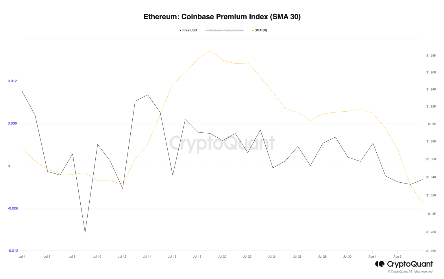 Greatest Trader analyzed ETH’s CPI on a 30-day moving average and found that “there has been a substantial shift in sentiment within the U.S. market, as evidenced by the noticeable downward trend in the premium index.”