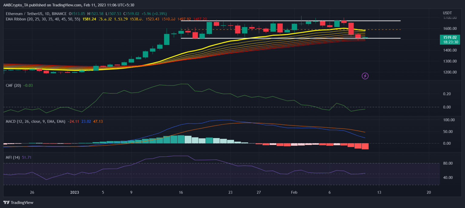ETH’s price action has not been in investors’ favor lately, as its weekly chart registered a decline. As per CoinMarketCap, ETH was down by over 8% in the last seven days, and at the time of writing, it was trading at $1,519.80 with a market capitalization of more than $186 billion.