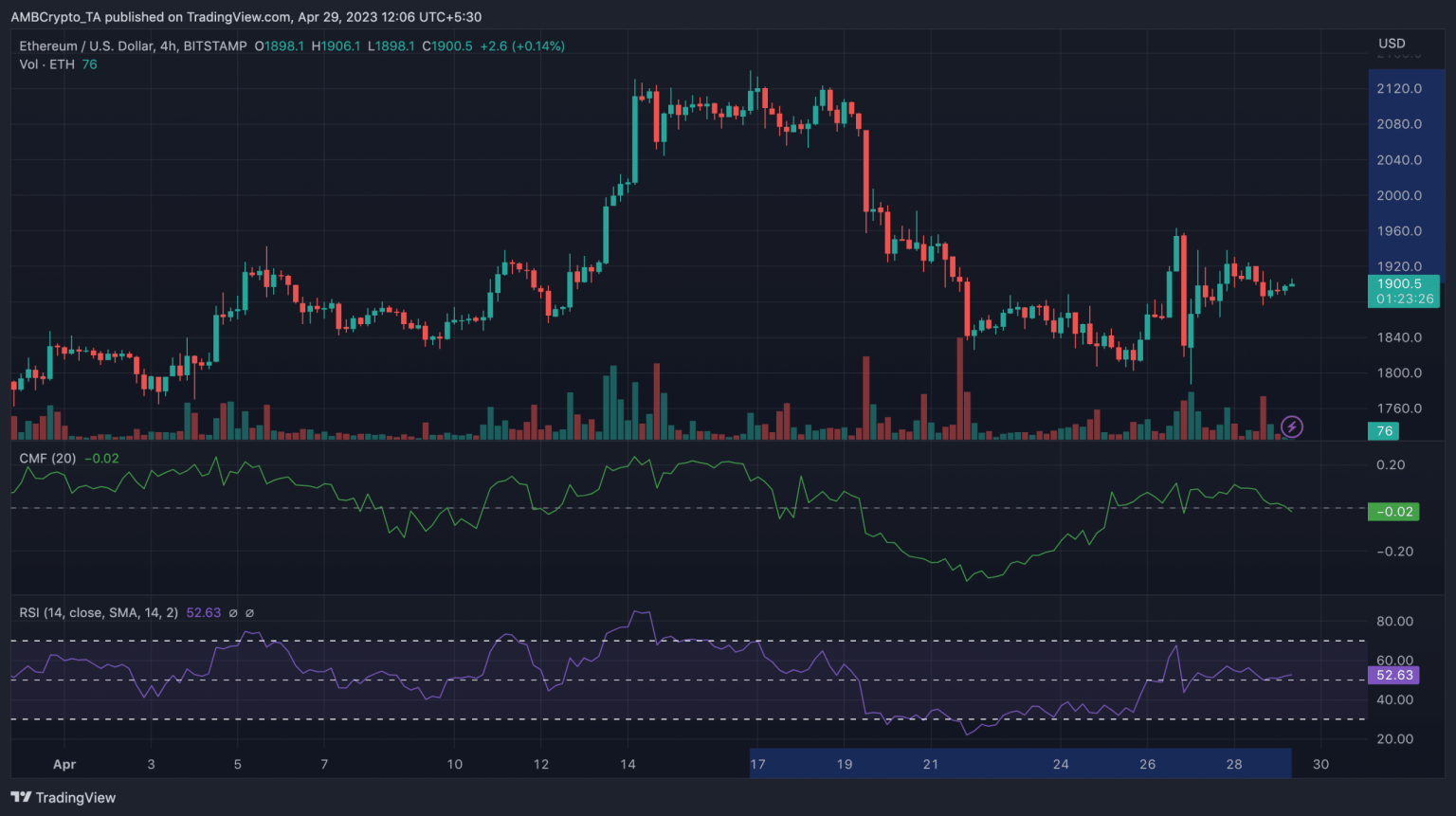 Since reaching this month’s high on 16 April, the prices of ETH fell by 11.30%. At press time, ETH was trading at $1900.3. Its CMF was at -0.02. This indicated a slightly bearish market sentiment for ETH, implying that the selling pressure might be marginally higher than the buying pressure.