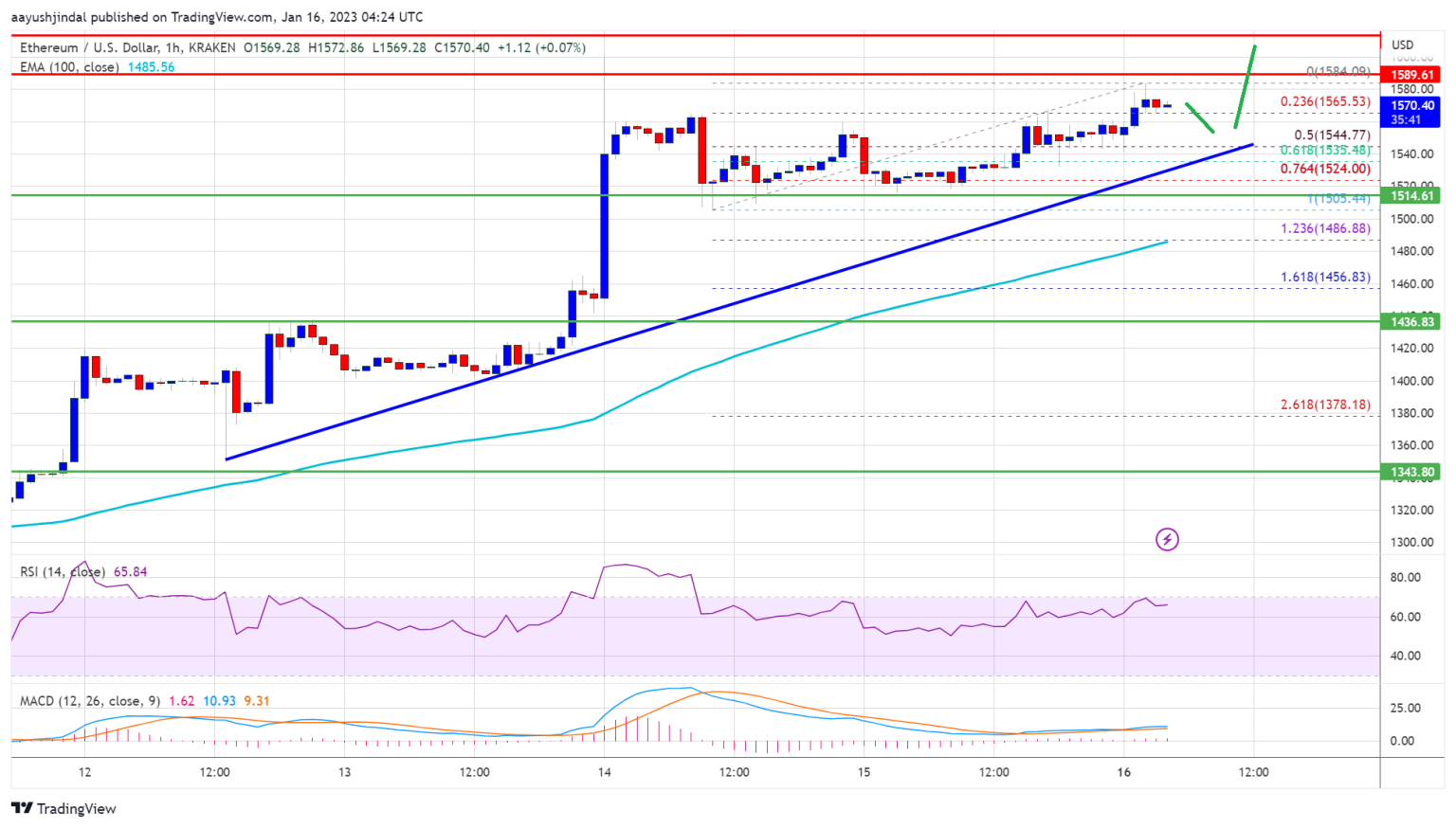 The price even climbed above the $1,500 resistance zone. A high is formed near $1,584 and the price is now consolidating gains. Ether price is now trading above $1,500 and the 100 hourly simple moving average. There is also a major bullish trend line forming with support near $1,540 on the hourly chart of ETH/USD.