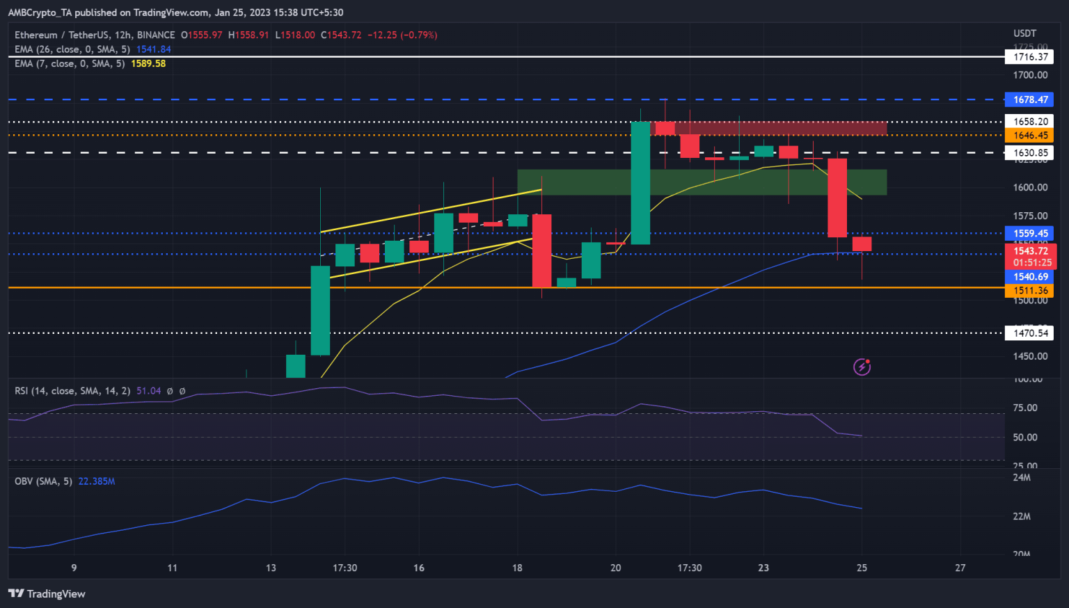 At press time, ETH struggled to break above $1,560 as BTC hovered below the $22,800 level. Therefore, BTC’s loss of traction and velocity could force ETH into a short-term range before bulls attempted to target the green zone.