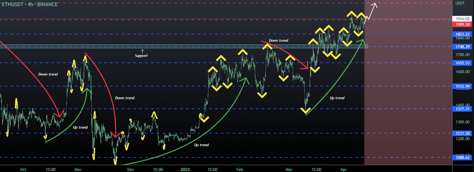 At the time of writing, ETH is trading at $1,908, experiencing a slight dip of over 0.5% in the past 24 hours. Leading crypto analyst, TradingStat, forecasts an imminent breakout above the $2,000 threshold. If the ETH price surpasses the resistance line of its double-top at $1,940, investor buying pressure is expected to rise in anticipation of the Shanghai upgrade.