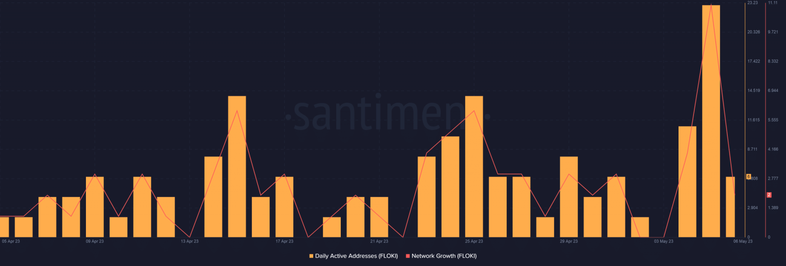 The news of the listing infused a lot of energy into FLOKI’s ecosystem. The daily active addresses and network growth spiked to their 2-month highs on 5 May. This suggested rising demand for the memecoin, as per Santiment.