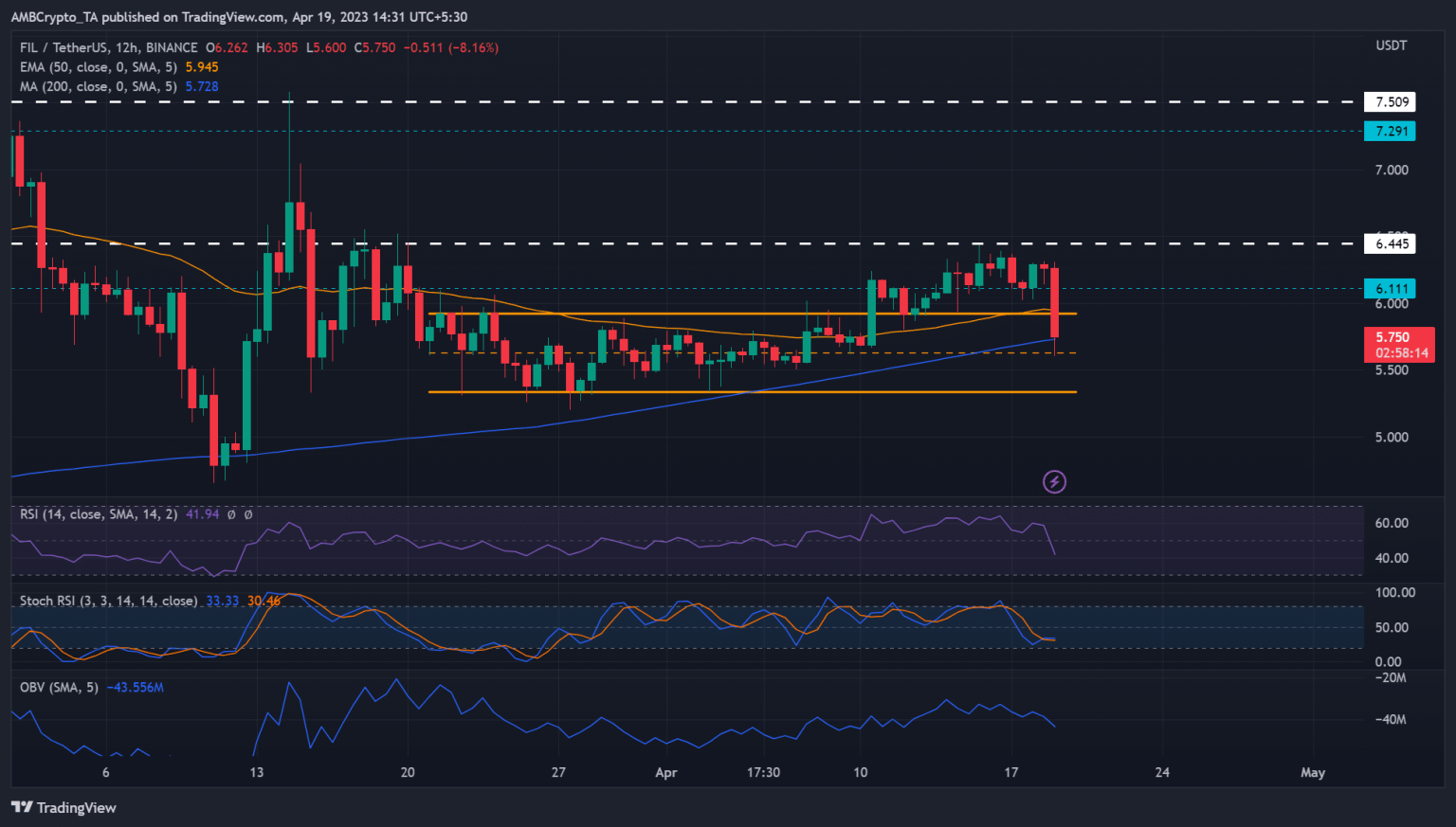 At press time, FIL broke below a key confluence support area near $6 and the 200-MA (Moving Average) of $5.728, reinforcing increasing sellers’ influence in the market.