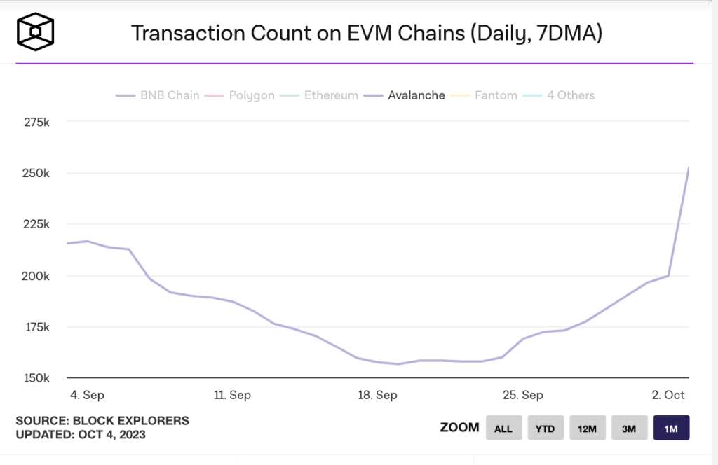 Transactions on Avalanche, meanwhile, have shown a significant uptick, with figures jumping from 158,000 on Sept. 20 around the time Stars Arena launched to over 250,000 by Oct. 3, according to The Block’s Data Dashboard.
