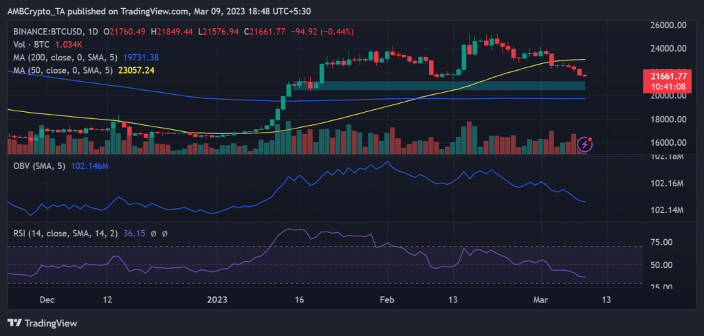 By the close of trading on 8 March, the BTC price, when viewed on a daily timeframe, had dropped by a total of 2.21%. It was selling at about $21,600 as of this writing, down about 0.40% in the same timeframe.