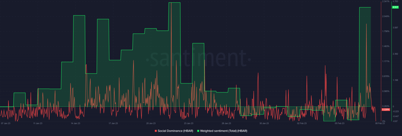 HBAR’s on-chain volume saw a sharp uptick in the last 24 hours. This is the largest spike in volume that the cryptocurrency has achieved so far this month. This is important because the price has been stuck in a range for the first week of February 2023. In other words, a major volume shift may help the price overcome the press time limbo.