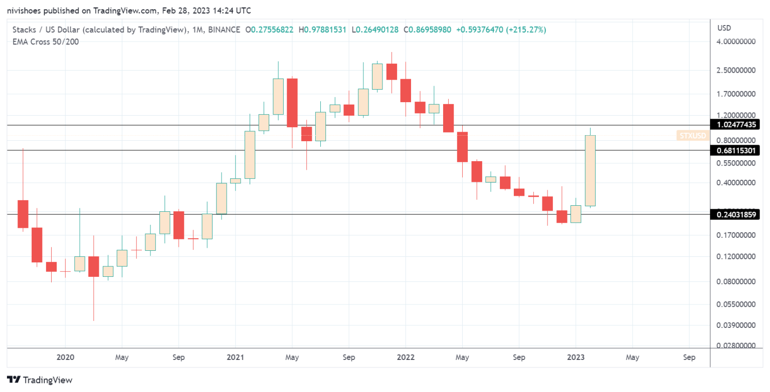 The fundamentals of the Stacks blockchain do not corroborate with the price surge, which suggests that it could be purely speculative given the potential for Stack’s growth. In the short term, STX risks a pullback from the top of its trading range in both STX/USD and STX/BTC pairs. Nevertheless, if buyers can conquer resistance at $1.02, there’s a probability of STX taking a shot at all-time highs of $3.40.