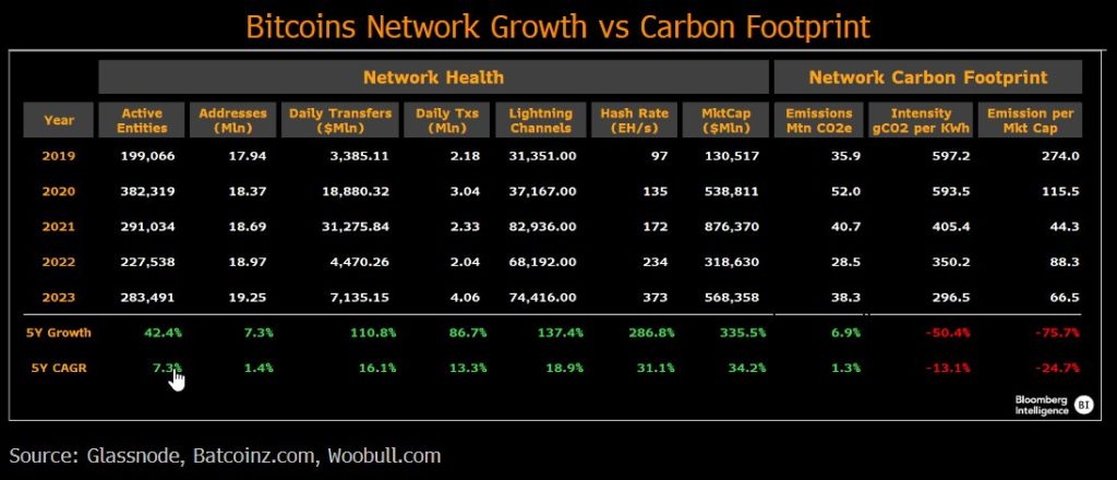 As evident from the stats below, while the network has grown in practically all key performance indicators (KPIs) of on-chain activity, carbon footprints have continued to decline, much to the delight of Bitcoin supporters.