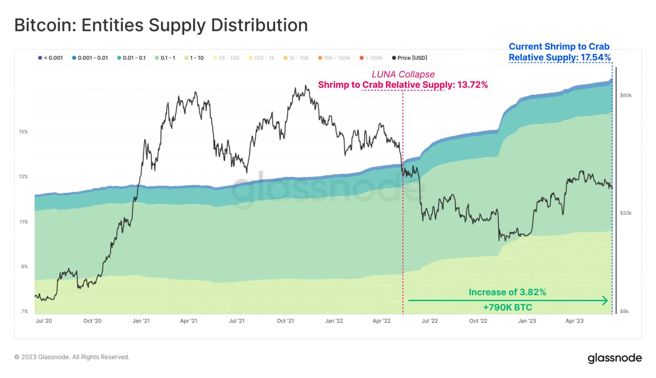 What’s fascinating to note is that this cohort, composed of Shrimps (holding less than 1 BTC) and Crabs (holding between 1-10 BTC), saw another sharp increase in its share after the FTX bankruptcy episode. Among other factors, this was indicative of increased demand for self-custody.