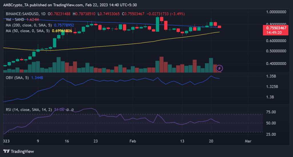 SAND saw a price increase from 17 – 20 February, adding 14.77% to its worth, according to a daily timeframe analysis. There has, however, been a strong sell push and a value decline as of this writing. A drop of about 8% was seen, trading at about $0.76.