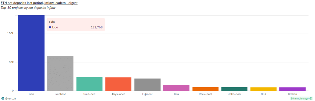 The total value locked (TVL) in Lido has reached a new peak of $14.75 billion, showcasing a growth of 3.84% over the past seven days. This increase was attributed to the combined effect of token price growth and an influx of new deposits. Furthermore, Lido took the lead in net new deposits on the Ethereum Beacon Chain, with a total of 132,800 ETH deposited within the past week.