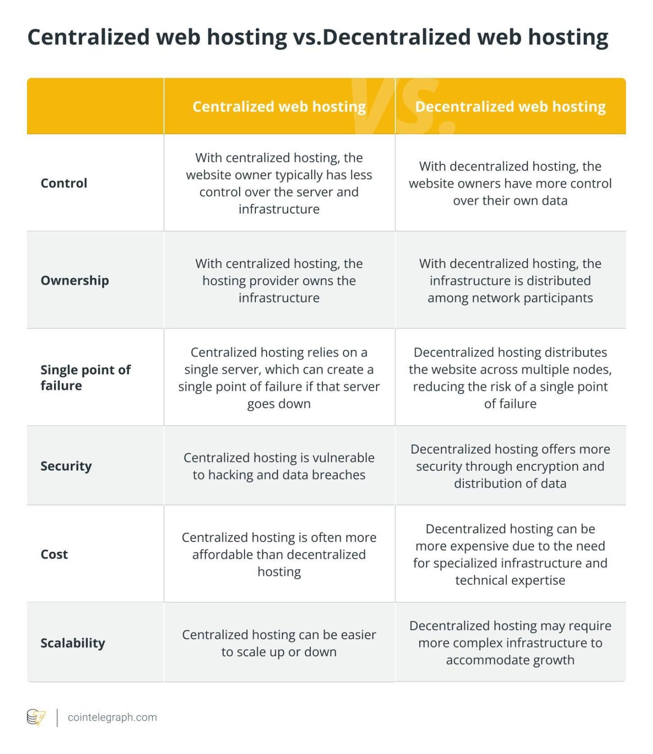 Centralized and decentralized web hosting are two different approaches to hosting websites. Here are the key differences between the two: