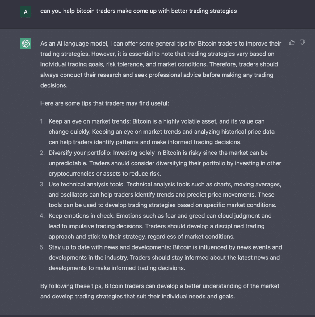 In November 2022, the AI model ChatGPT was launched to the public. In fact, it quickly gained significant attention, too. With its broad range of capabilities and versatility, the question arises whether there are other ways that ChatGPT can lend its expertise, such as assisting BTC traders in formulating and applying improved trading strategies.