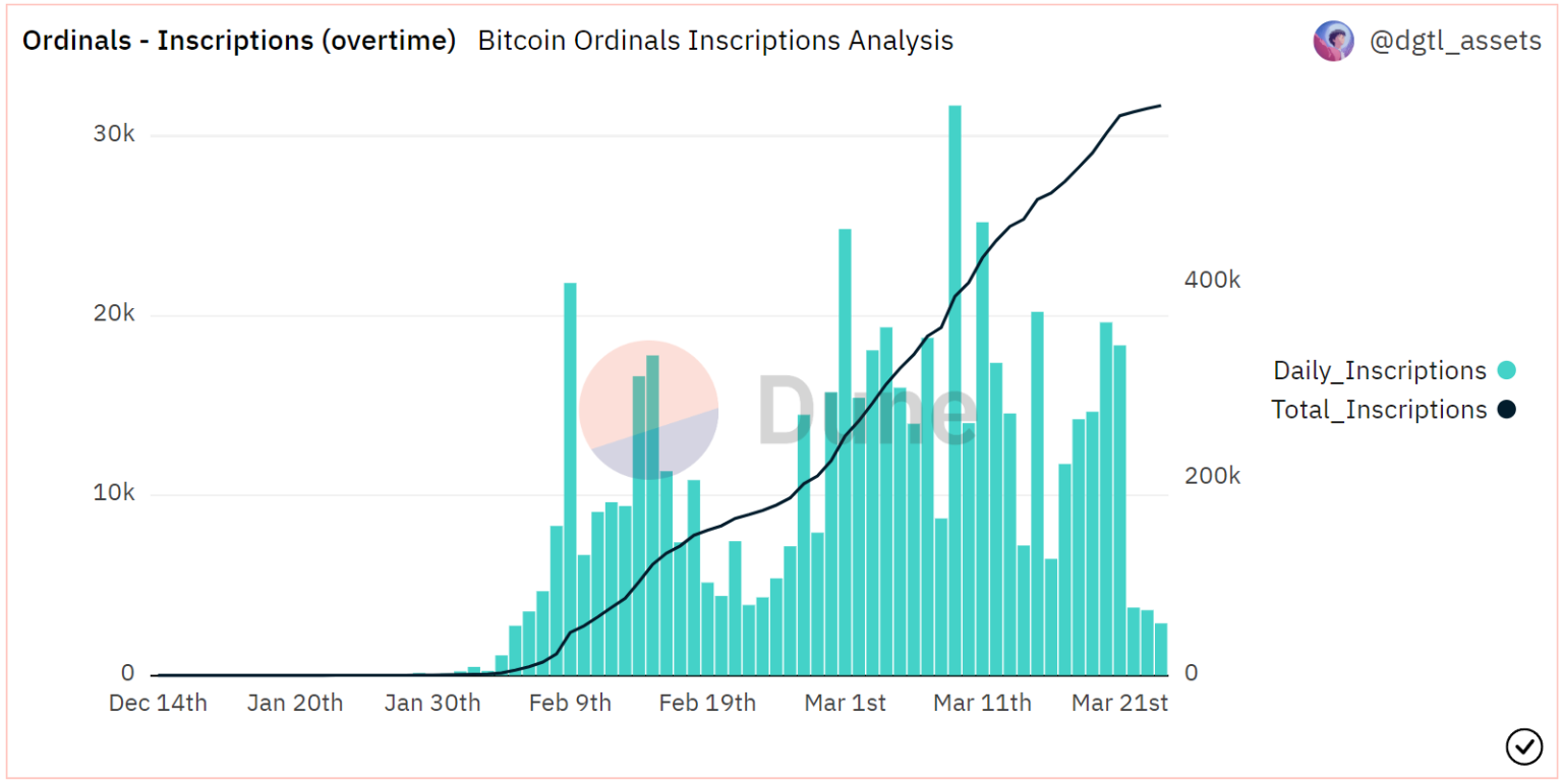 Dune dashboard from data analyst dgtl_assets shows that the Ordinals inscription activity remains robust, with nearly 580,000 NFTs inscribed in less than three months.