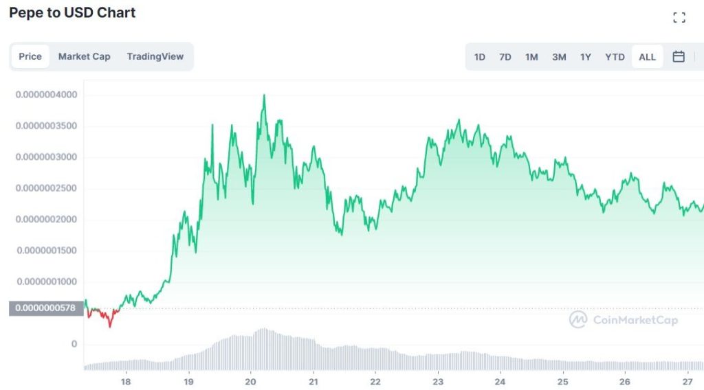PEPE has led the memecoin charge. Chart from CoinMarketCap
