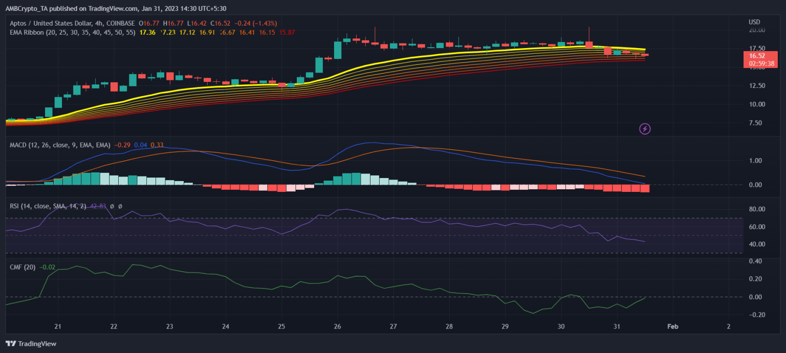While these developments gave hope for better days ahead, the opposite was revealed by the crypto’s price action. CoinMarketCap’s data pointed out that after a commendable week, APT’s price declined, as it was down by 14% in the last 24 hours. At the time of writing, it was trading at $16.46 with a market capitalization of over $2.6 billion.