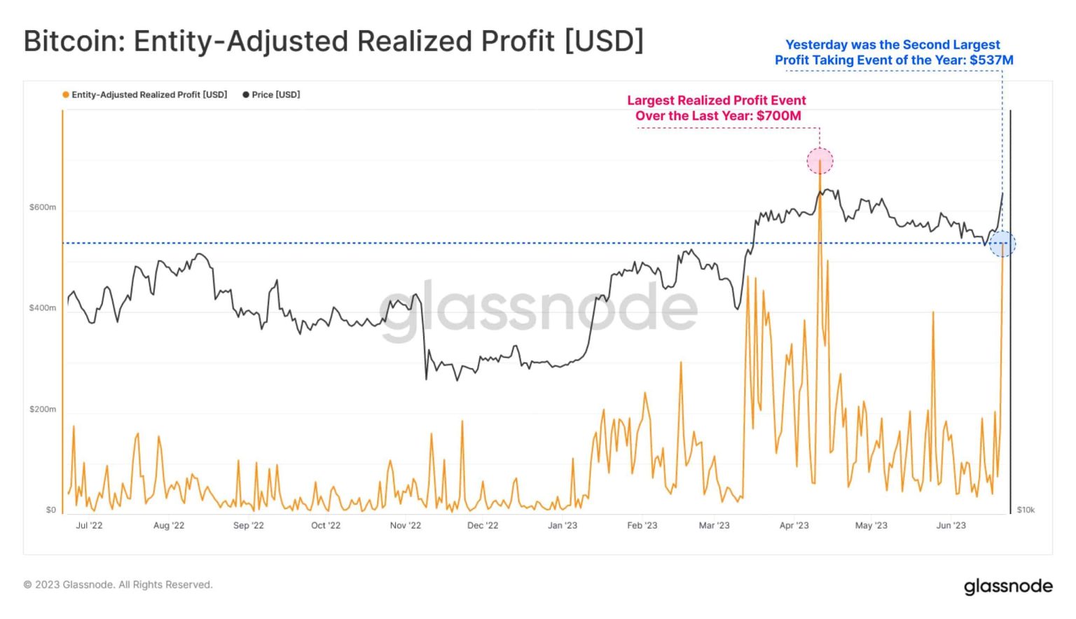 Glassnode, in another tweet, pointed out a noteworthy development. As per the tweet, following the recent uptick in Bitcoin price action, market participants locked in a non-trivial $537 million in profit, the second largest profit taking event over the last year.