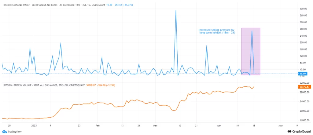 As per data from CryptoQuant analysis by CryptoOnchain, a rise in the sale of BTC led to a price correction over the last 24 hours. As shown in the chart below, BTC long-term holders (18 months-2 years) selling their BTC led to a drop in the price of the king coin.