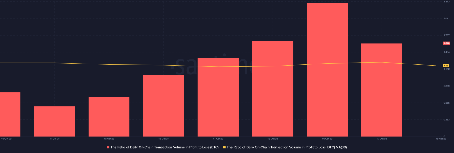 According to data from Santiment, the ratio of BTC’s daily on-chain transaction volume in profit to loss observed on a seven-day moving average was 1.23 at press time. This meant that for every unit of BTC sold at a loss, there were 1.5 units sold at a profit.