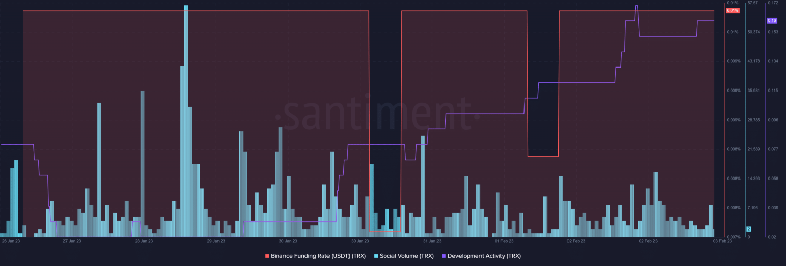 TRX’s performance on the metrics front also remained decent, as several of them supported the possibility of a price hike. For instance, TRX’s Binance funding rate remained consistently high, reflecting high demand from the futures market. Development activity also increased, which suggested higher efforts of the developers in improving the network.