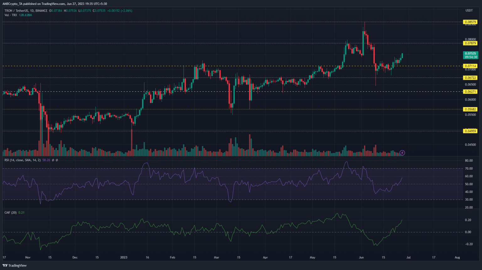 Long-term buyers can be encouraged by the Relative Strength Indicator (RSI) climbing above the neutral 50. At the time of writing, it stood at 58 showing that the bullish rally was strengthening. The Chaikin Money Flow’s (CMF) positive reading of +0.20 highlighted the significant capital inflows to Tron.